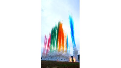 red /blue /orange /green smoke post salute , whistling .